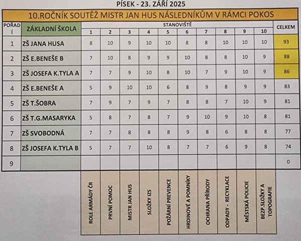VÝSLEDKY SOUTĚŽE MISTR JAN HUS NÁSLEDNÍKŮM 2025 - 23.ZÁŘÍ